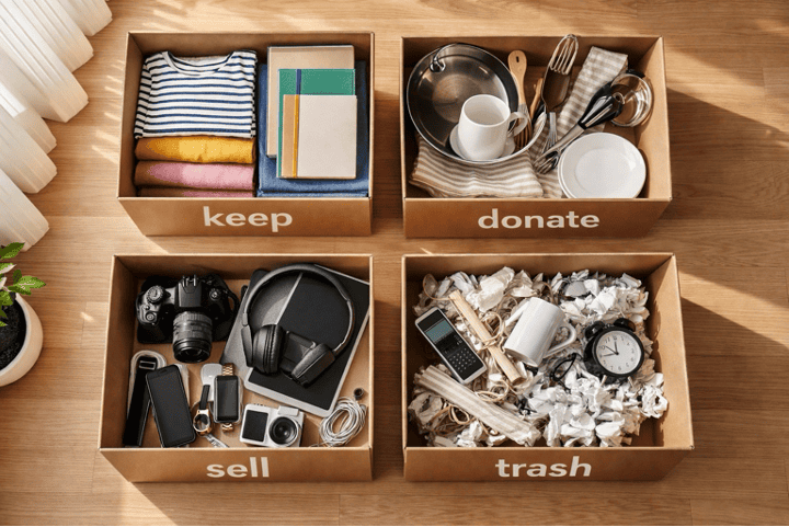 The goal here isn’t just to throw things away: it’s to get crystal clear on what’s coming with you, what needs temporary storage, and what’s leaving your life for good.
