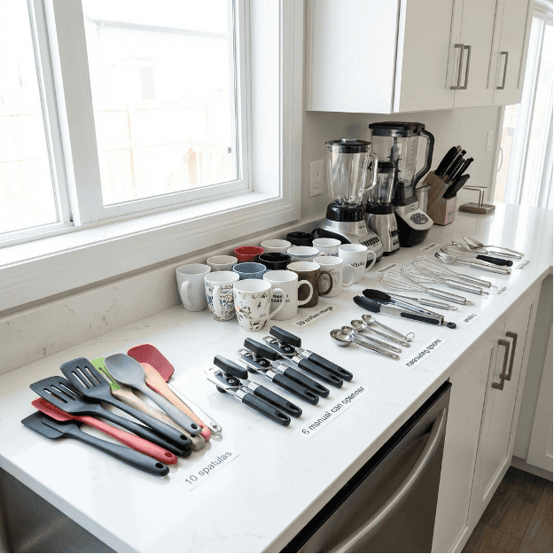 Your kitchen probably holds more duplicates than any other room in your house. Do yourself a favor and pull everything out of your cabinets and drawers at once. When you see five spatulas, three can openers, and enough coffee mugs for a small restaurant laid out on your counter, the decisions become obvious.