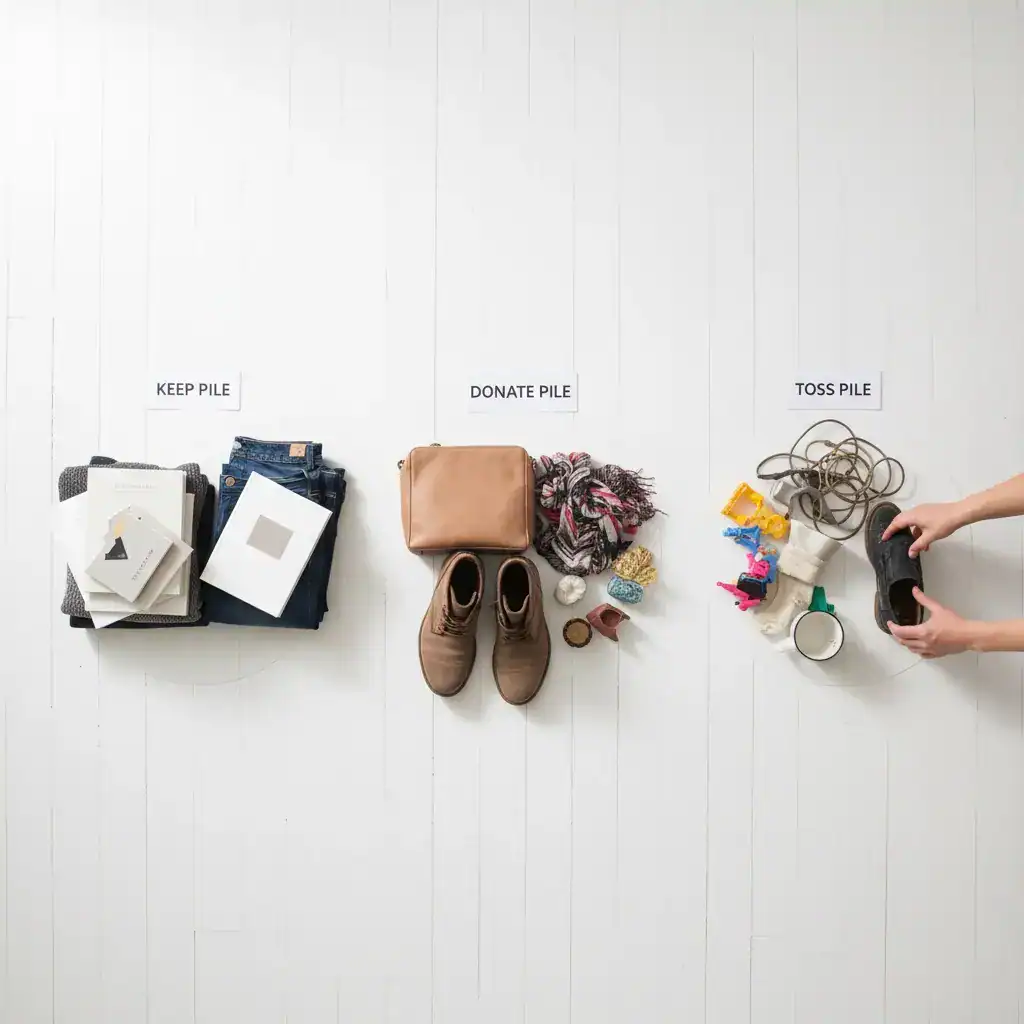 Keep: Items you use regularly, truly love, or absolutely need Donate: Things in good condition that someone else could use Toss: Broken, expired, or genuinely worthless items