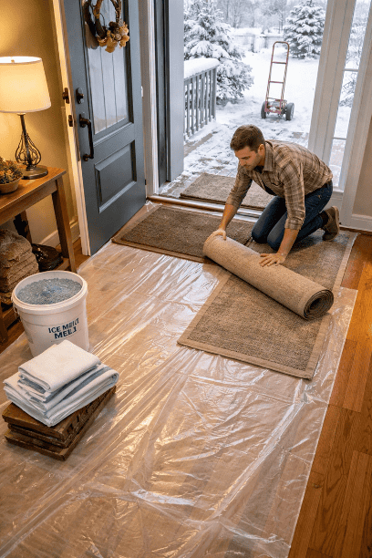 Meanwhile, your walkway is a sheet of ice. Your boxes are stacked in the garage, and you’re realizing that cardboard doesn’t exactly love getting wet. The movers finally arrive, and within twenty minutes, there’s a trail of slush and salt residue across your living room hardwood floors.